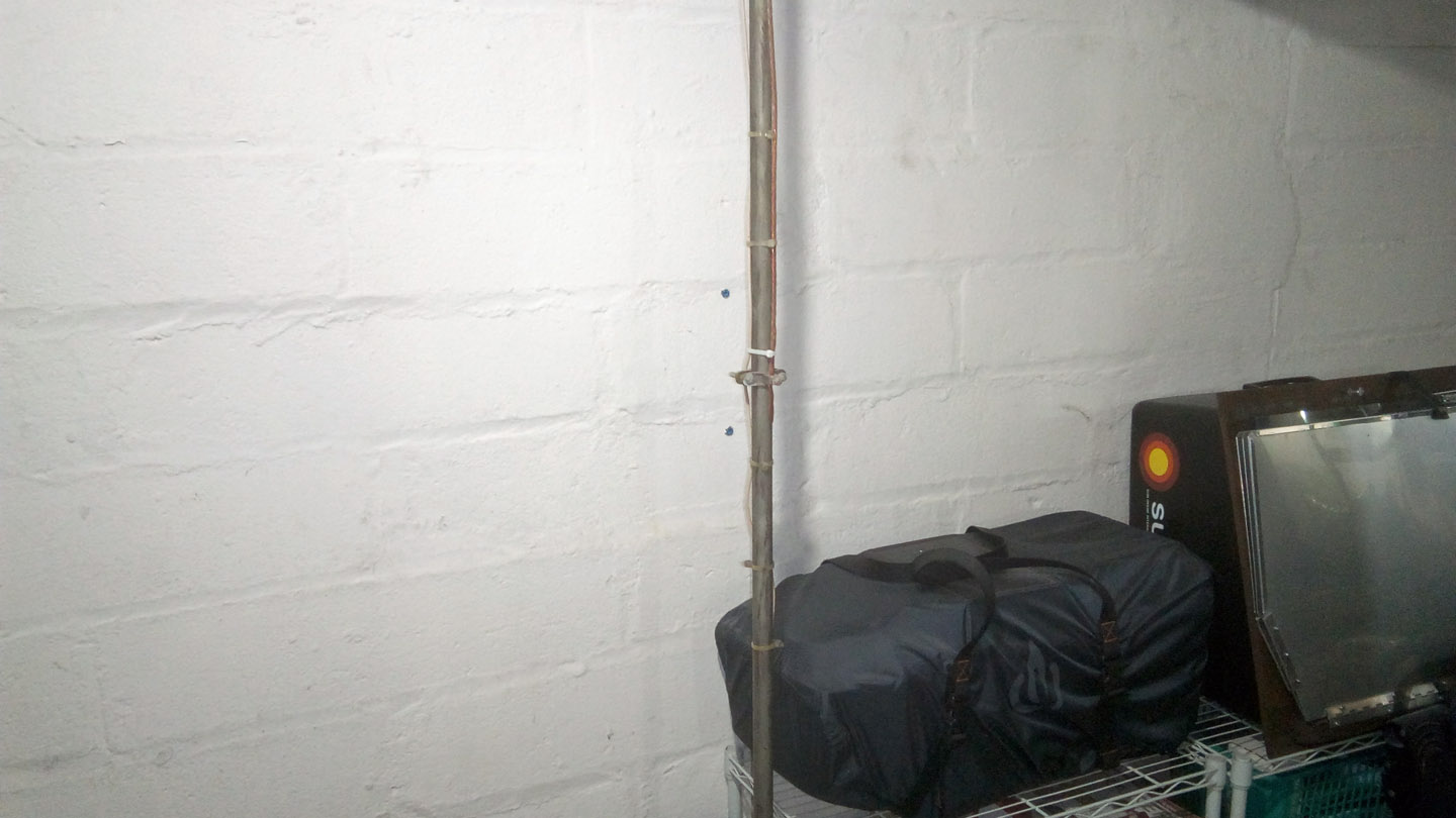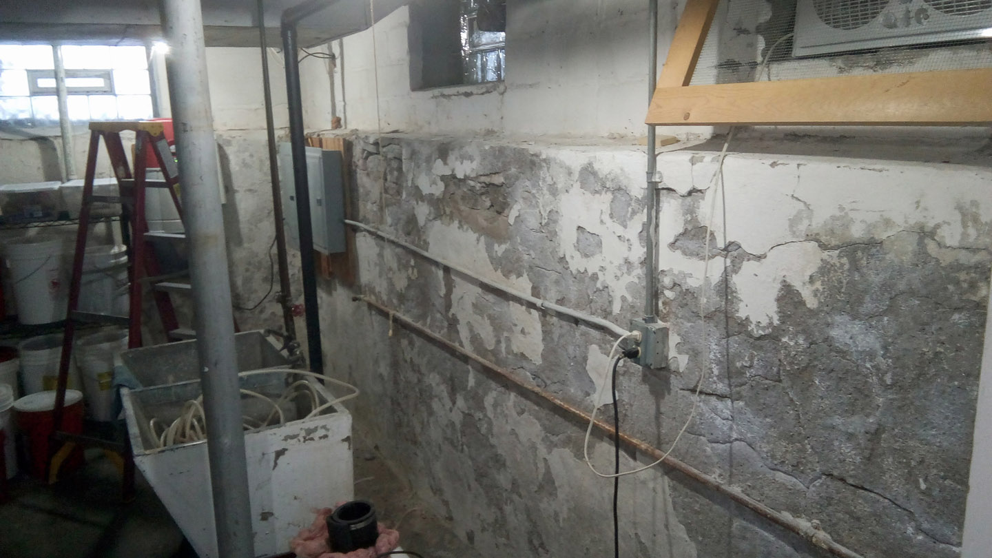 We have taken several steps to improve drainage around the foundation since we bought the house. Water penetration has been mitigated, but moisture damage is extensive in some parts of the basement. Here is part of a wall that shows signs of water penetration:
