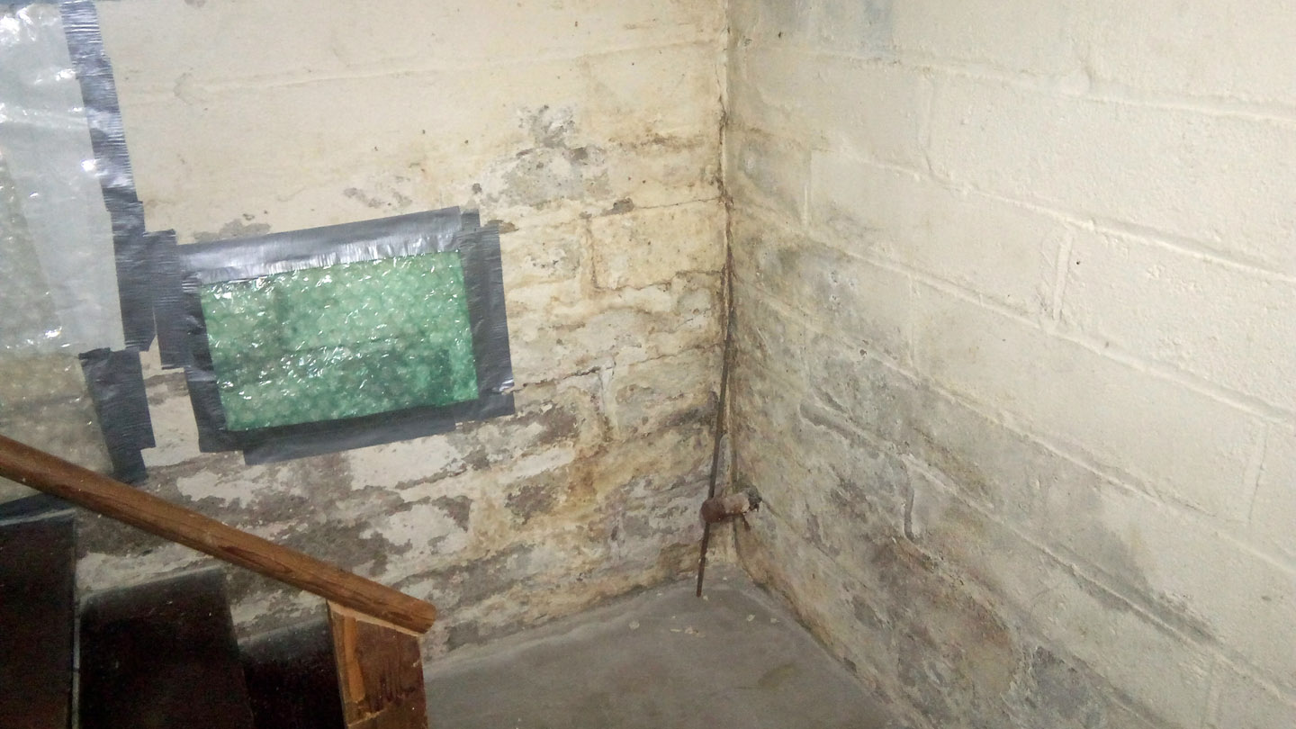 The cement blocks are covered in a thick masonry sealer that has sloughed off in some places, which happens when water penetrates the foundation from outside. Staining from mildew confirms the presence of water in this corner of the basement: