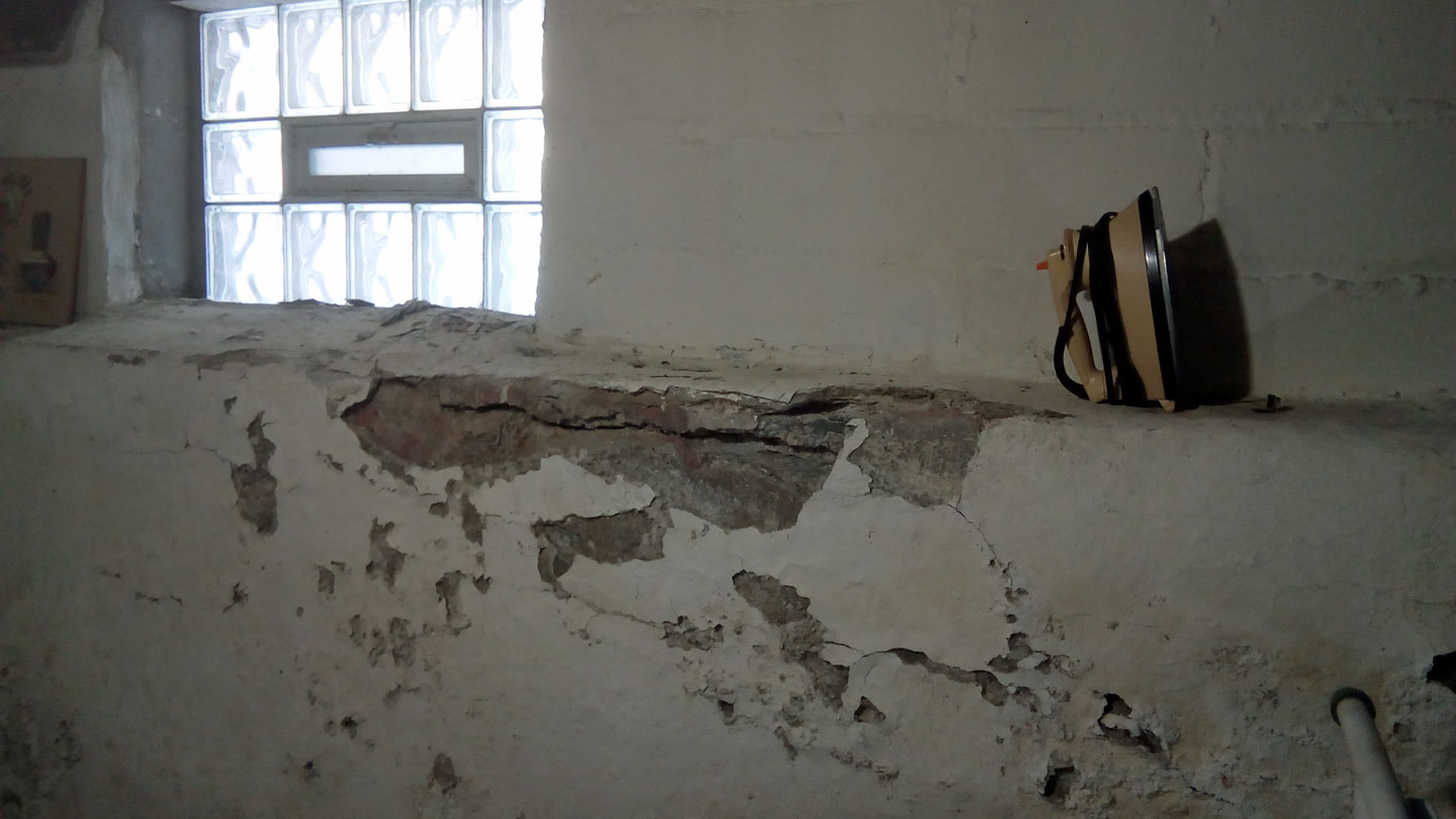 The construction of this wall is evidently different than the cement block walls shown in the previous pictures. The top of the wall, the part that is visible from the outside of the house, is made of the same cement blocks found in the other walls. Below that is a much thicker wall, covered in mortar. The top of this shorter wall forms a ledge at about eye level in the basement, which is grade level outside. Here is a wall section where I have scraped off most of the crumbling top coat: