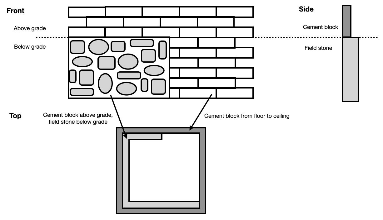 Stone foundations are characteristic of homes built before 1900. Sometimes the part that we see above ground is made of brick for a finished look, but stone is used to carry the weight of the house. Around 1900, cement blocks came into widespread use in this region, rapidly replacing stone as the material of choice because of their advantages. Our house was built in 1908, so why was our foundation built this way? If its builders were using cement block at all, why not construct the entire foundation with it?