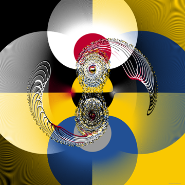 The classic Spanish courtship dance is performed by a pair of co-rotating Lamb-Oseen vortexes. Curiously these are created using the same color set as my Mondrian-based works: red, yellow, blue, black, white, and gray. The appearance of non-primary shades such as orange and purple happens where thin, closely spaced lines of one primary color are printed over a solid block of a different primary color.