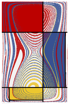 These pictures were made by computing particle pathlines in a closed box. Stokes flow is driven by lateral motion of the top and bottom surfaces, which creates a vortex pair having two lobes enclosed by a streamline in the shape of a figure eight or hourglass, as shown below. Strictly speaking the U velocity is parabolic rather than constant along the top and bottom surfaces. I do this to avoid a discontinuity at the corners. The result is a smoother flow better suited to this type of visualization.