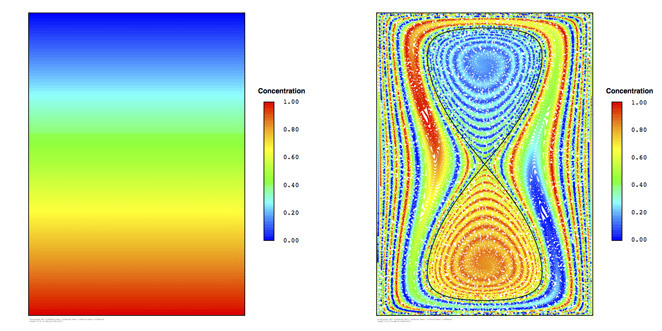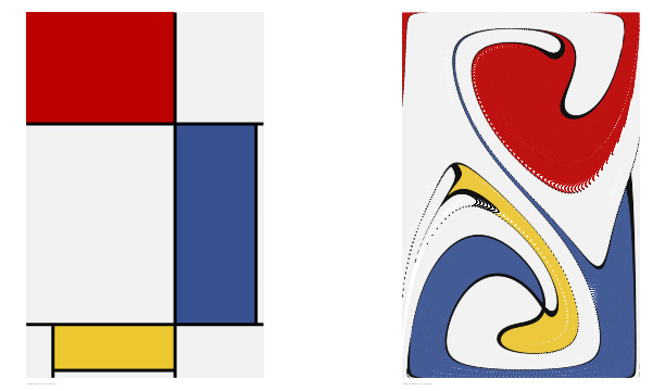 The longer the reference image is mixed, the more we perceive the characteristic "figure 8" shape of this type of flow as it superimposes itself on the geometric regularity of the Mondrian image. Had someone else made these pictures and shown them to me, I would have immediately recognized its similarity to an important class of flows in fluid mechanics. Below I show the effect of mixing a stratified liquid in a lid-driven cavity taken from my research. On the left is an initial distribution (color might represent salinity, for example), and on the right is the distribution after some time of mixing.