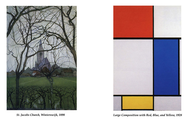 Mondrian began his career as a figurative painter. His early paintings include landscapes, portraits, and still lifes. An early work, from 1898, is shown on the left below. His style was influenced by impressionism and pointillism. Over the course of his career, his work evolved towards a style that was linear, abstract, and non-representational. This terminus is well illustrated by his 1928 work, Large Composition with Red, Blue, and Yellow, shown on the right below. This is the style Mondrian is famous for today.