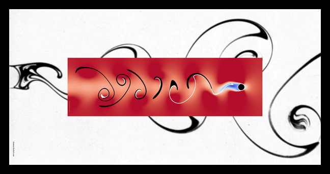 If you aren't convinced that flow visualization constitutes figurative art, take a look at this example from my Vortex Street collection. The inset image in this next picture seems rather abstract, but it is drawn by an accurate simulation of perhaps the most recognizable phenomenon in fluid mechanics, the shedding of nearly parallel lines of vortexes in the wake behind a bluff body in a stream. The background image is a photograph of a flow visualization experiment of this same phenomenon, named the Kármán vortex street.
